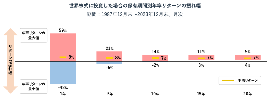 運用期間が長くなるほどリターンが安定しやすいことがデータで示されています。